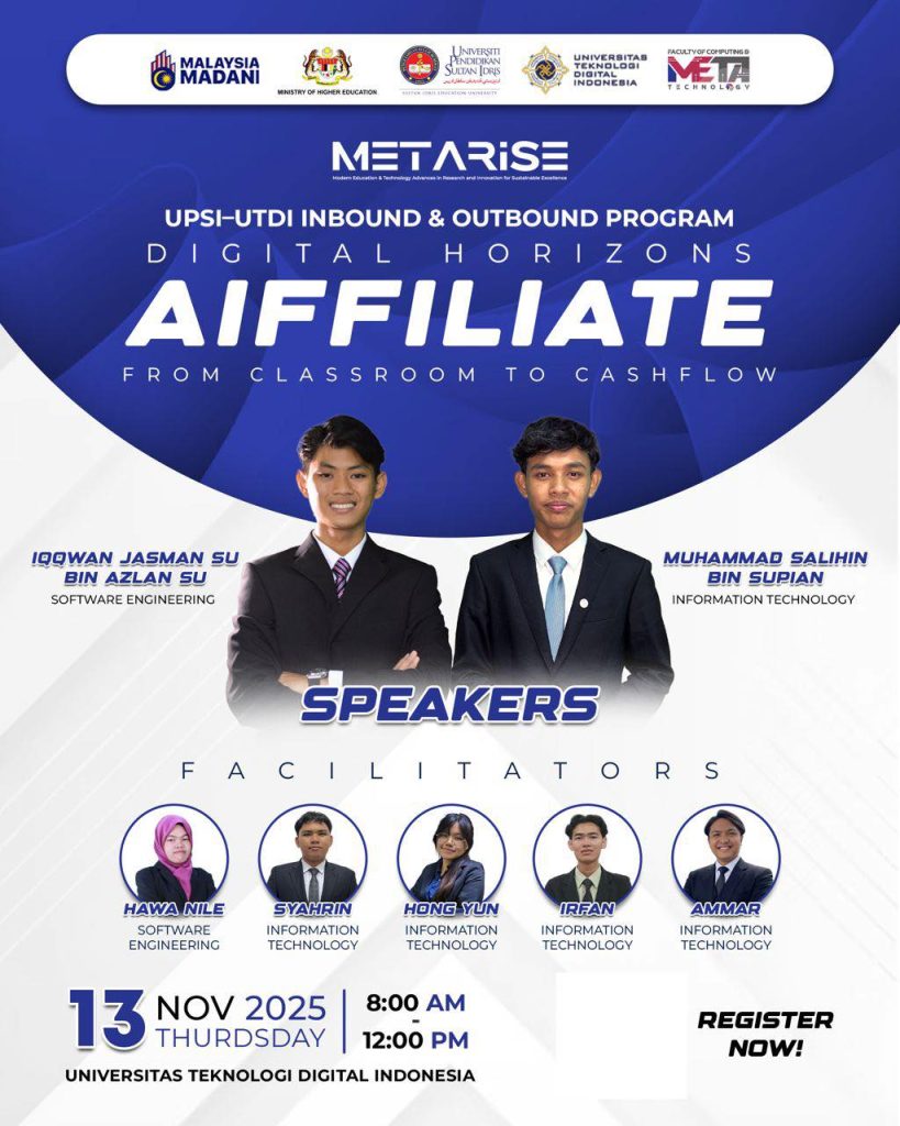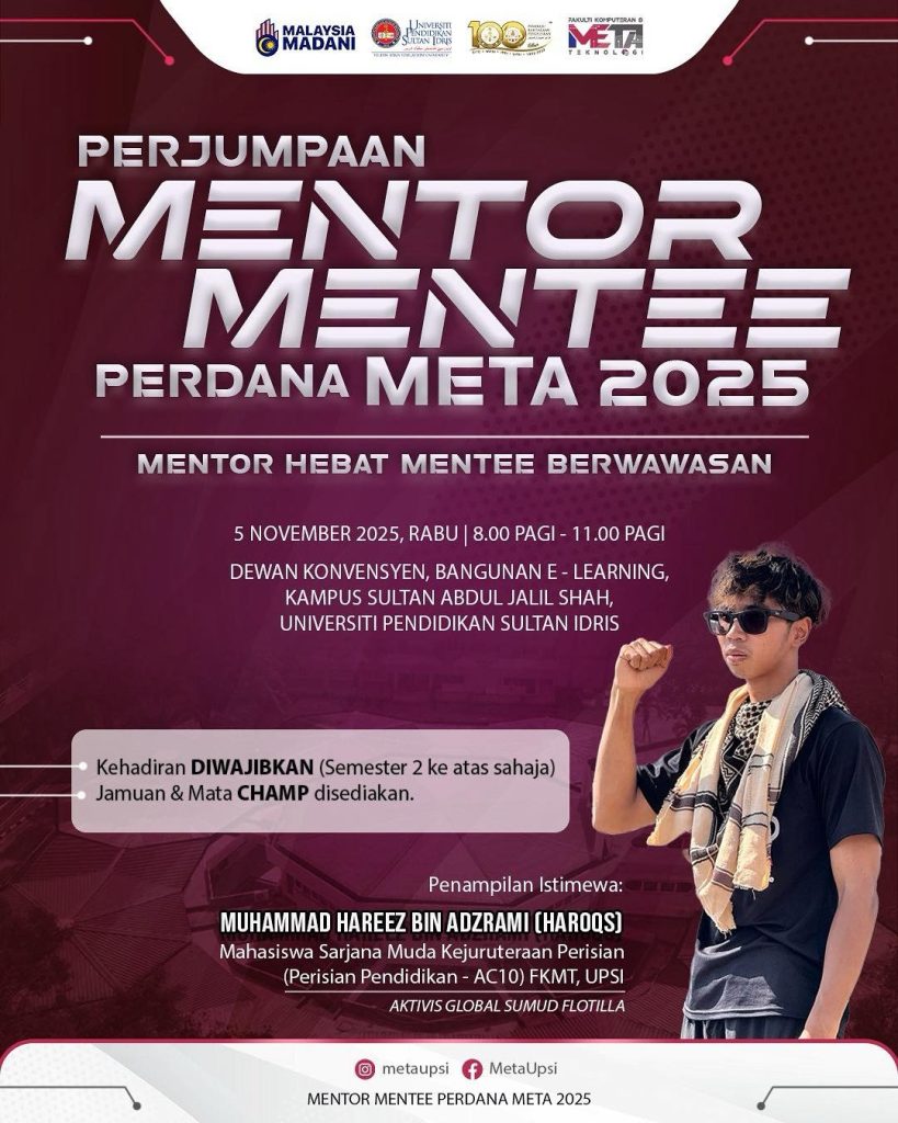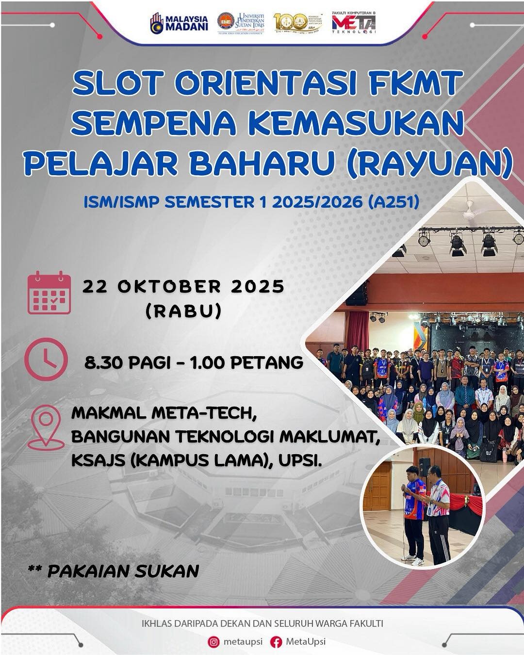 Sukacita dimaklumkan bahawa Unit Promosi & Kemasukan, Bahagian Hal Ehwal Akademik (BHEA) akan mengadakan taklimat bagi membimbing pelajar lepasan Diploma (calon feeder) Universiti Pendidikan Sultan Idris membuat permohonan kemasukan ke peringkat Sarjana Muda melalui sistem UPU Online. Sesi taklimat ini bakal dilaksanakan pada 25 – 28 Februari 2025 (Selasa – Jumaat) secara dalam talian.
